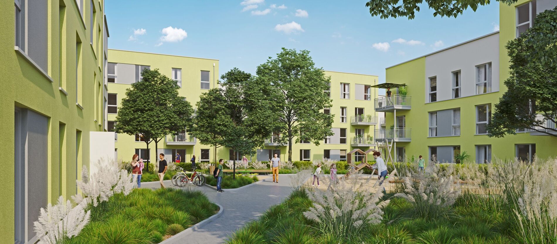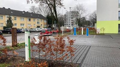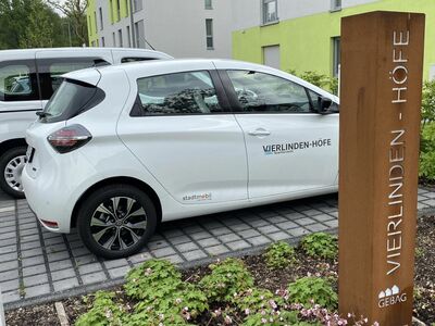 In den "Vierlindenhöfen" in Duisburg-Walsum stellt die GEBAG den Mieter*innen und Anwohner*innen zwei Quartiersautos im CarSharing zur Verfügung. Auf den reservierten Stellplätzen an der Goerdeler Straße 24a stehen zwei batterieelektrisch angetriebene Fahrzeuge - ein Kleinwagen Renault ZOE und ein Familienauto Opel Combo-e - zur Nutzung bereit.